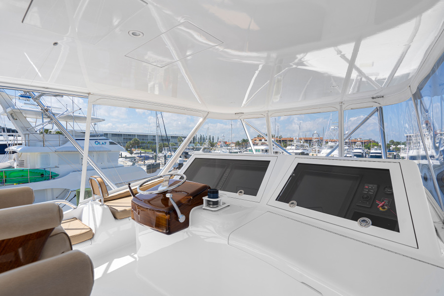 Custom teak helm pod, power-actuated pop-down console, Release steering wheel & engine control handles. Other features included in front of the helm a large double wide bench seat with storage below and a rod storage locker on port bench. Two Blue Water teak helm chairs provide seating for the captain and guest.