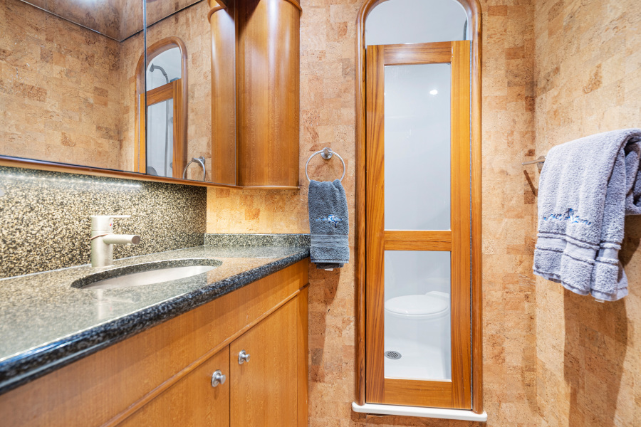 The VIP head area boasts a large walk-in shower, great storage for guests and generous counter space.
