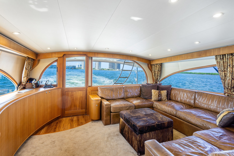 The salon is complimented by hand rubbed satin finished cherry wood throughout, along with a well designed layout providing great interior volume. The custom U-shaped distressed leather sofa accompanied by a custom ottoman with storage underneath, will seat 8 guests. To starboard houses the 42" Samsung pop up TV, along with a full bar, ice machine, and more great storage.