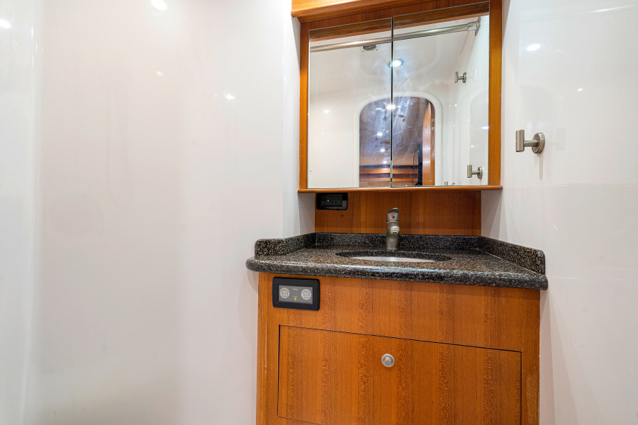 The crew area is located in front of the front engine room bulkhead. It is a very spacious area accompanied by a full head and shower, great storage, and oversized over/under style berths. It is easily accessible through the engine room through a water tight bulkhead door.