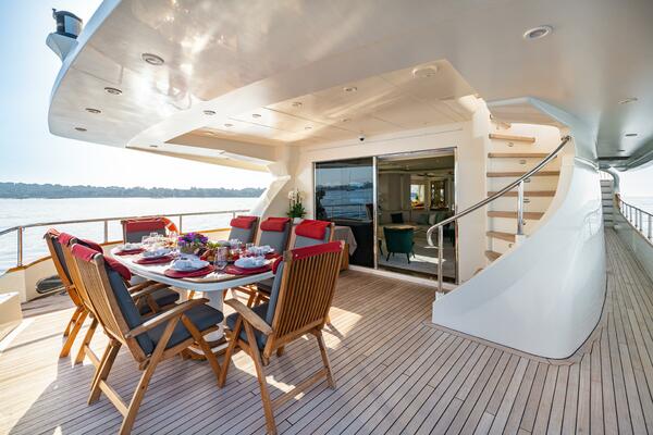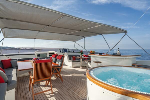 The yacht accommodates up to 10 guests in five cabins: a full-beam master suite on the main deck with an ensuite bathroom including a bathtub, two VIP cabins, and two guest doubles on the lower deck. Separate crew quarters allow for a team of seven.