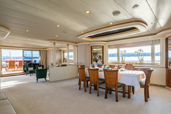 Her interior, created by Gregory C. Marshall, features neutral-toned panelling, upholstery, and carpets. The saloon and dining area are arranged in an openplan layout, offering flexibility for a future owner to modify the configuration.