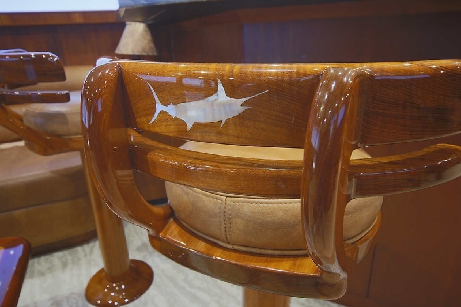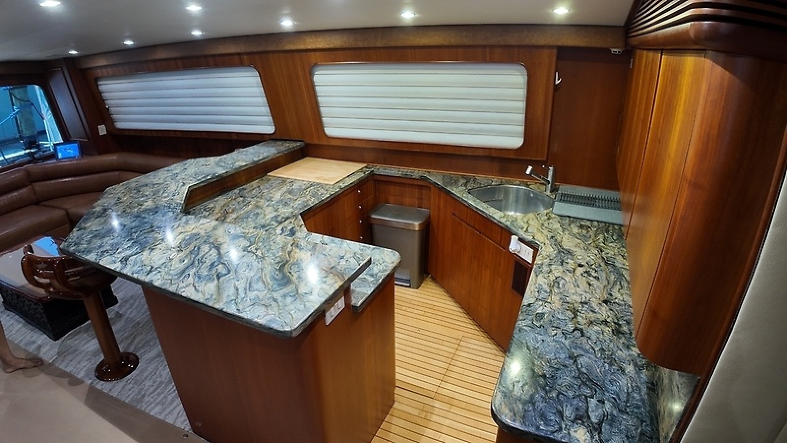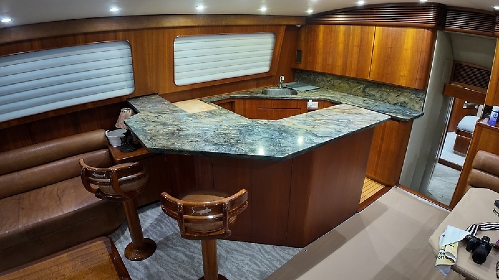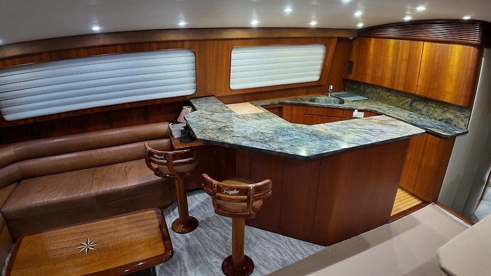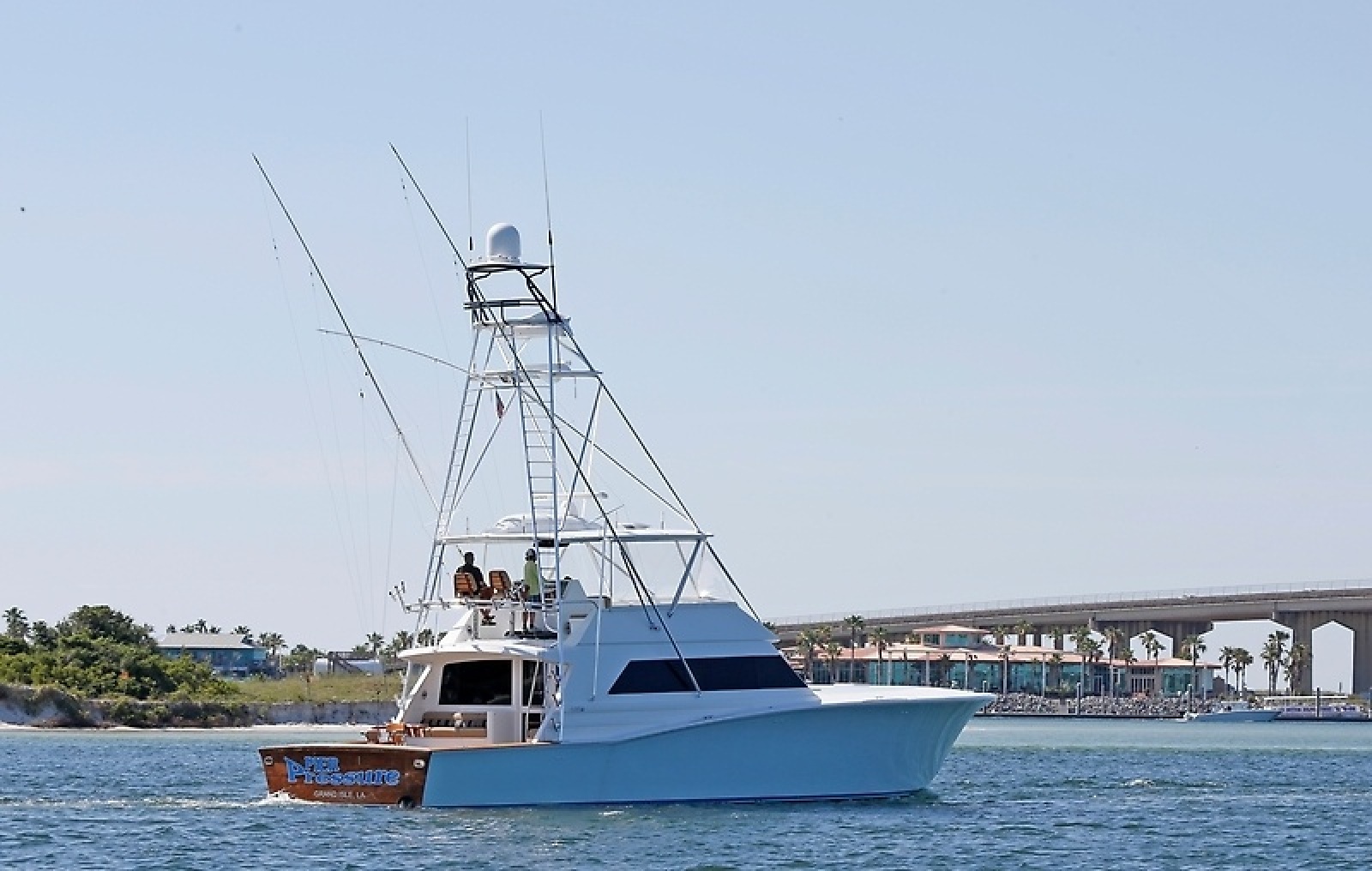 On the water, she delivers in a big way. Built on a Donald Blunt-designed bottom, "Pier Pressure" cruises comfortably at 35 knots burning around 120 gallons per hour, with a top speed of 44 knots when you're ready to open her up.